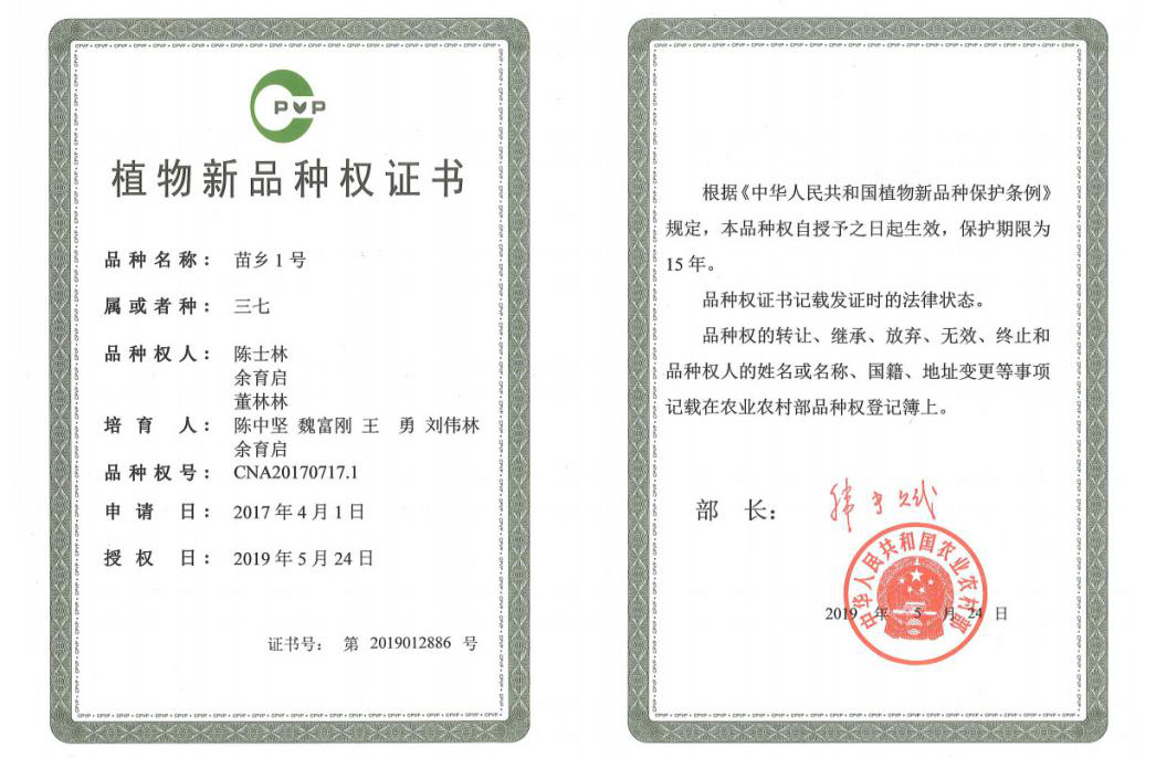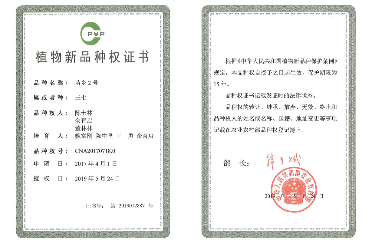 2019年,首次獲批國家植物新品種權(quán)的三七新品種——苗鄉(xiāng)1號(hào)、苗鄉(xiāng)2號(hào)誕生。