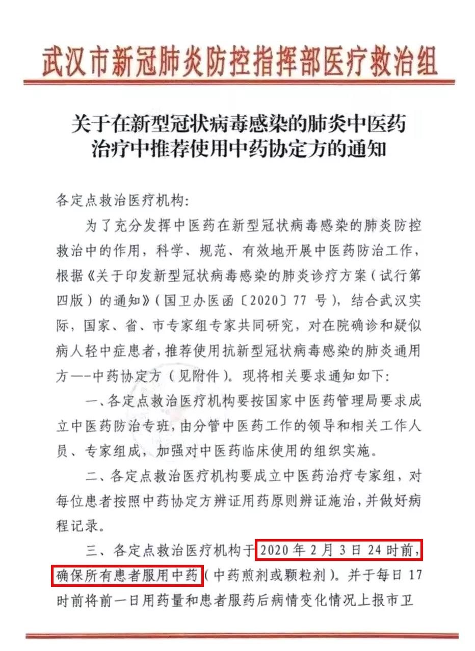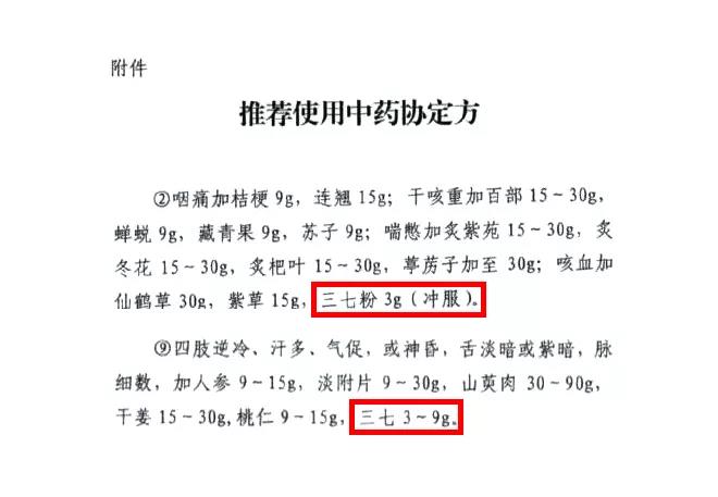 在2020年2月2日武漢市新冠肺炎防控指揮部醫(yī)療救治小組關(guān)于推薦使用中藥的協(xié)定方名單中二處使用三七,并強調(diào)2020年2月3日24時前確保所有患者使用中藥。