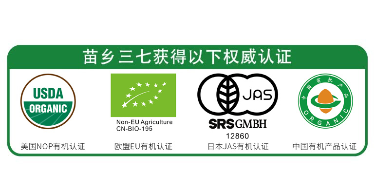 自2001年起,苗鄉(xiāng)三七相繼并持續(xù)獲得日本JAS有機認證、中國有機產(chǎn)品認證,成為目前市場上高品質三七品牌代表。